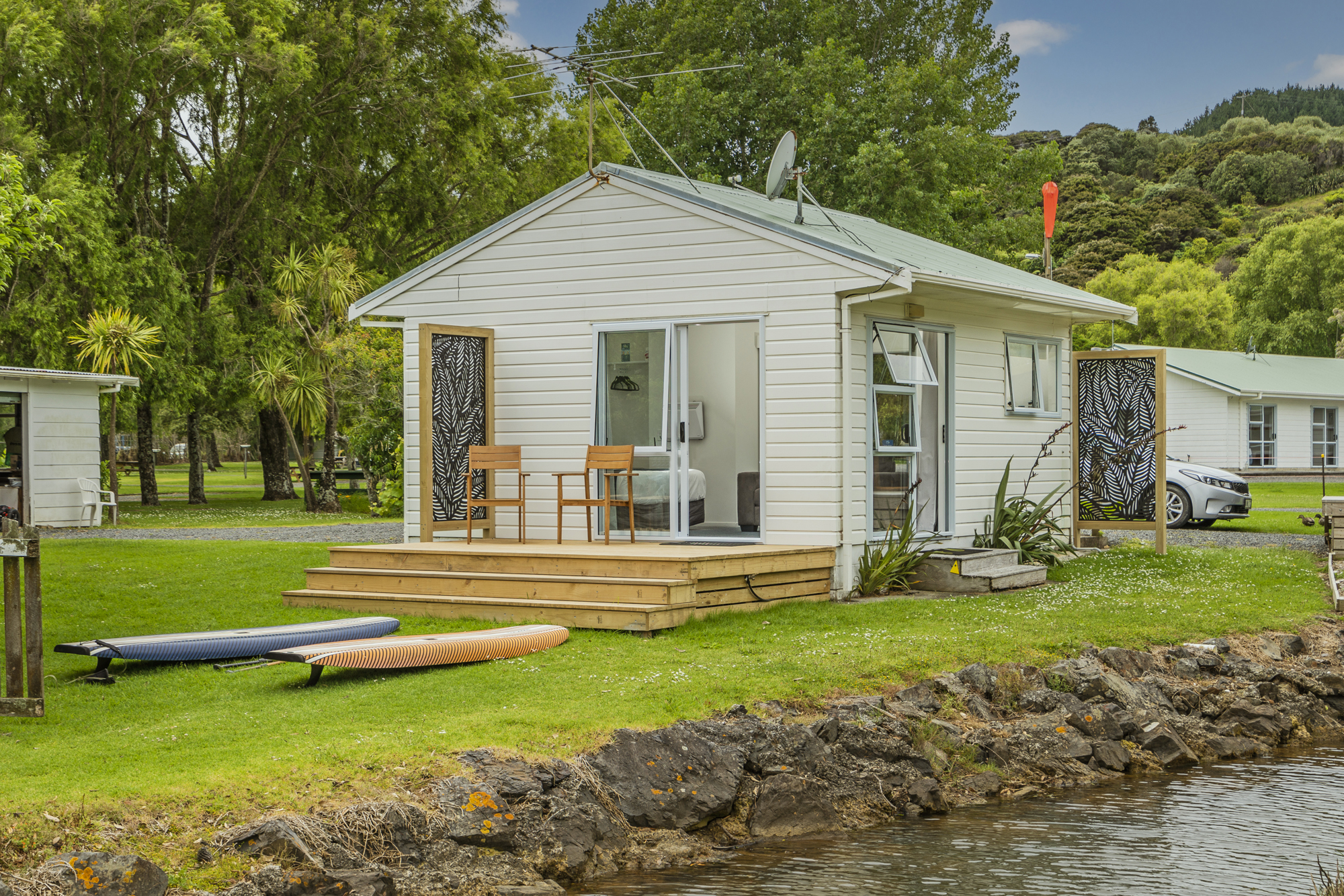 Two ranchsliders open this unit up to views over the farmland, native bush, stream and beach area. Witness the famous Shelly Beach sunsets from your own private deck which steps down onto grass out onto the beach area – perfect if you are bringing your kayaks or paddleboards.