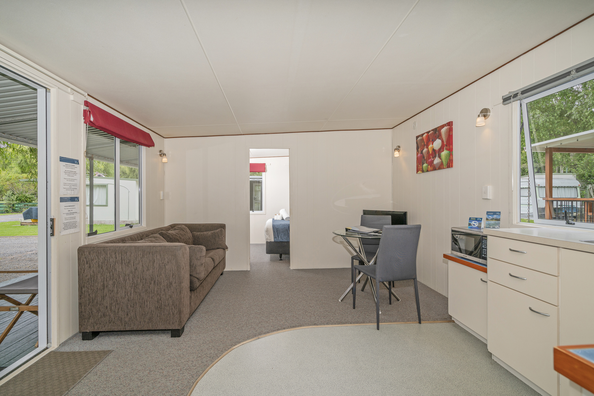 Being self-contained, it comes equipped with a basic kitchenette and its own bathroom. The units have a lounge area with a table and chairs, a couch and a television.